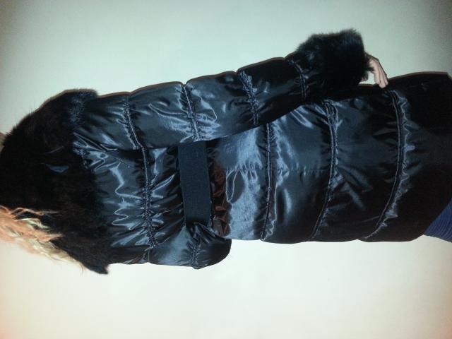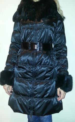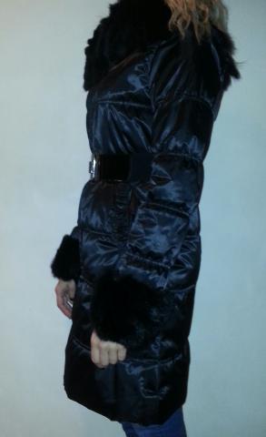 Juodos spalvos pūkinis paltas su prisegamu kailiuku ant rankovių ir apykaklės.