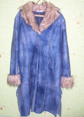 100 % chemicalfiber . melynas paltas,viduje su netikro kailio pasiltinimu . 63 cm rankoves, ilgis 75 cm plotis 53