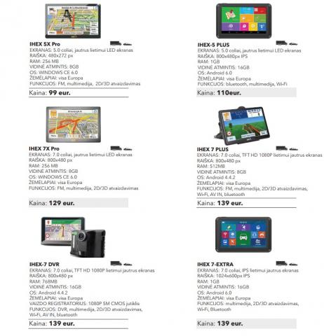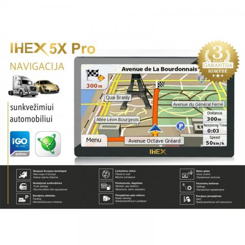 IHEX navigacijos automobiliams ir sunkvežimiams. Vienas už kitą ryškesni modeliai, naujausi Europos žemėlapiai, dar daugiau lankytinų vietovių. 1. NAUJAUSIAS GPS navigacijos modelis IHEX 5X Pro, navigacija automobiliui ir sunkvežimiui - 5 colių ekranas, raiška 480x272px, 256MB RAM, vidinė atmintis 8GB, operacinė sistema Windows CE 6.0, visos Europos naujausi žemėlapiai, FM, multimedija, 2D/3D atvaizdavimas. KAINA 85 EUR. 2. IHEX-5 PLUS IPS Android 6.0 SLIM navigacinė sistema AUTO + TRUCK - 5 colių ekran