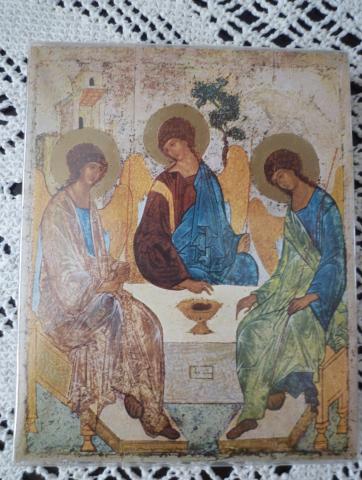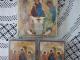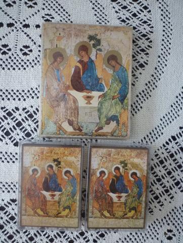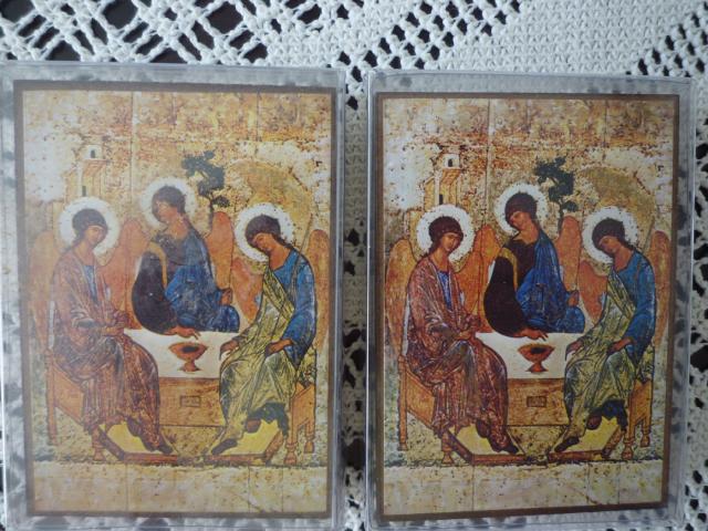 Mazos naujos ikonos su ipakavimu. Tiktu dovanai. Popierines reprodukcijos ant 0,5 cm storio pagrindo. Didesnes dydis 10,5x13cm, kaina 4 eur. Mazesniu dydis 7x9,5 cm (mazutes), kiekvienos kaina po 2 eur. Mazesnes pastatomos su atremiama kojele ant nugareles. Didesne be nieko (matoma foto).