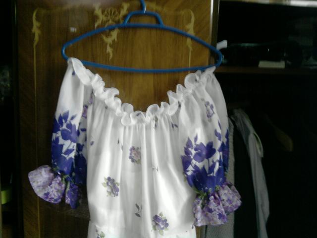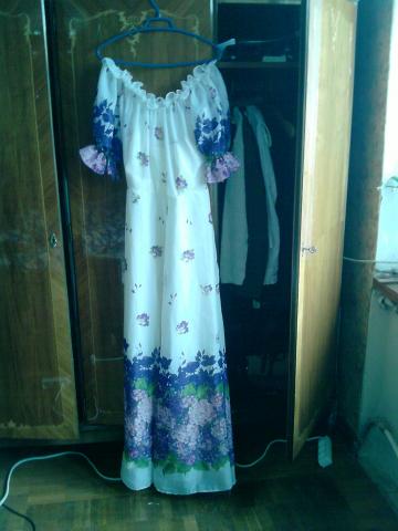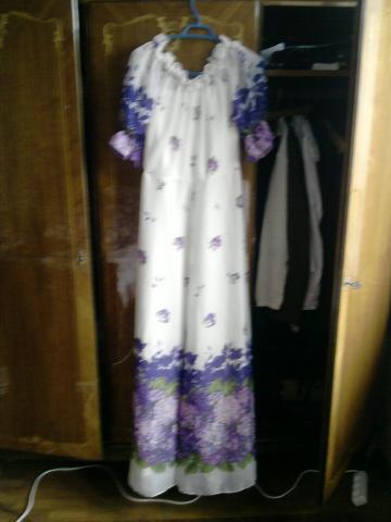 Ilga suknele ,tinka s/m dydziui . Nuotrauka nekokybiska, taciau ji yra nauja, skalbta tik du kartus. Balta su violetinemis gelemis. Galima nesioti kaip atvirais peciais, arba pakelti .