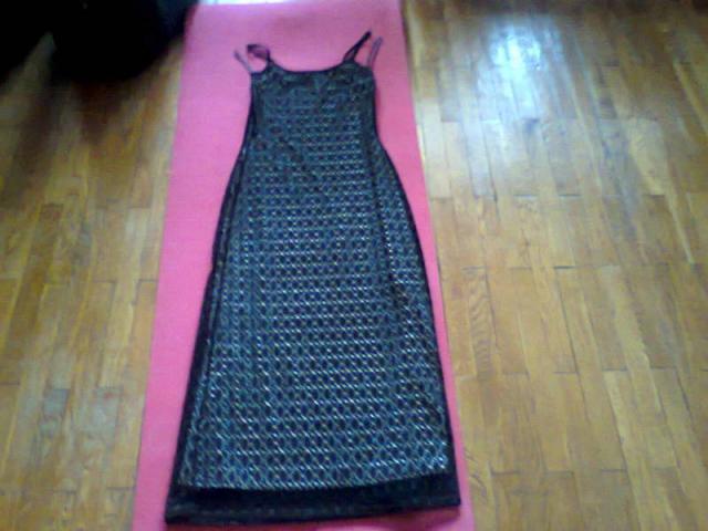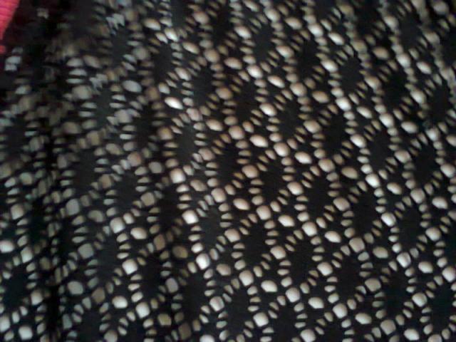 Ilga suknelė iš dviejų sluoksnių. Balta medžiaga ant kurios krinta raštuotas juodas audinys su skylutėmis.