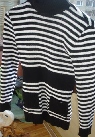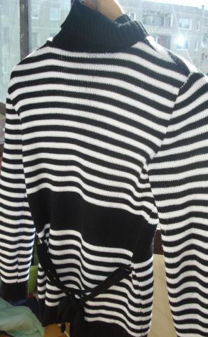 Ilgas, juodai baltas dryžuotas megztinis. Pardavimas vyksta Vilnius, Alytus, Daugai.