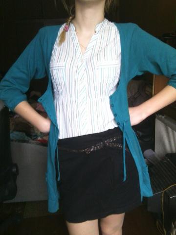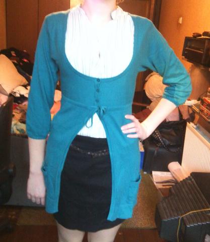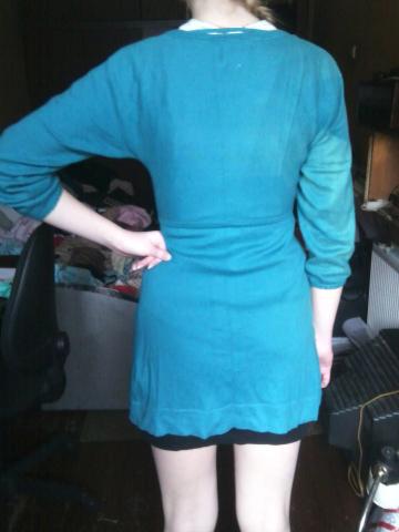 ilgas jūros spalvos megztukas, su 3/4 rankovėmis, sagutėmis ir raišteliu. Pull and Bear