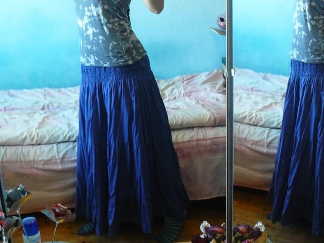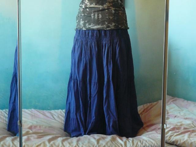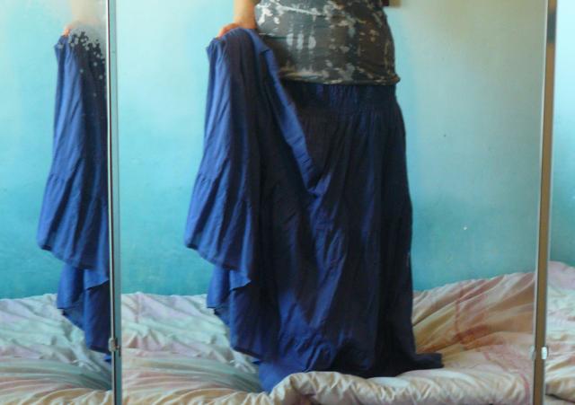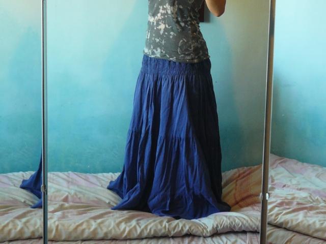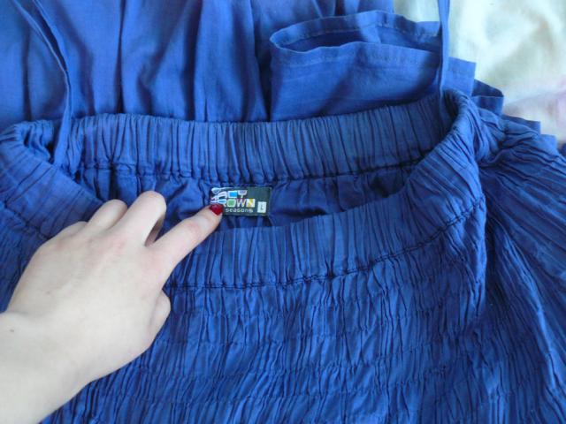 Ultramarinas. Su guma, todėl tiks įvairiems dydžiams, tikrai be problemų S-M, o kaip kiti nžn :) Ilgis 88cm. Nešiotas iki pirmo skalbimo.
