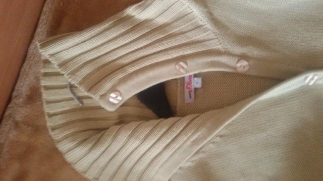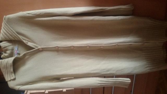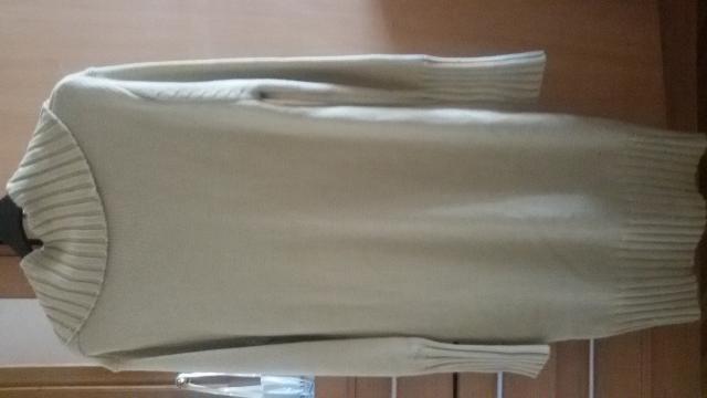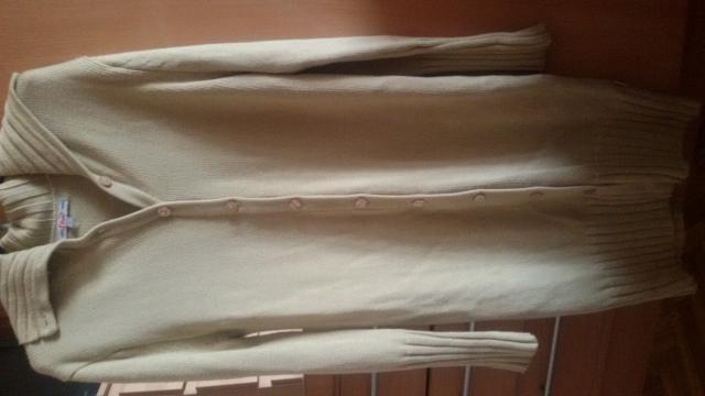 Ilgas smėlio spalvos megztinis, Užsegamas (gali būti kaip golfas). Ilgos rankovės. Turi atsarginę sagą. Sudėtis: 50 proc. medvilnės, 50 proc. akrilo. Dydis nurodytas L, tačiau pagal išmatavimus laikyčiau jį M dydžiu. Defektų neturi.