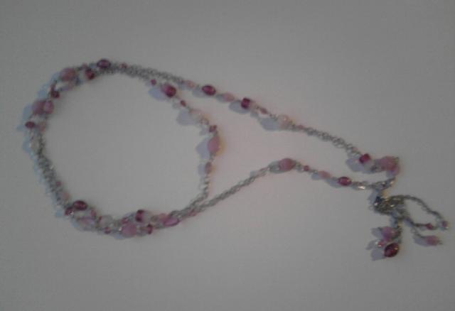 Labai stilingas, iš rožinių karoliukų ant grandinėlės suvertas vėrinys.