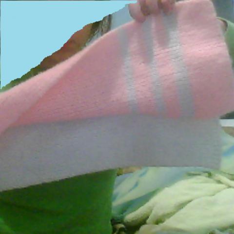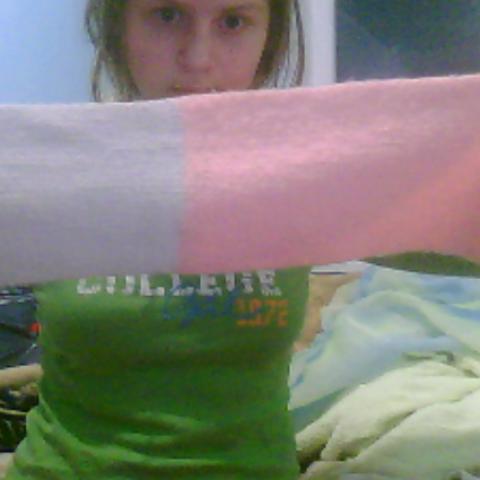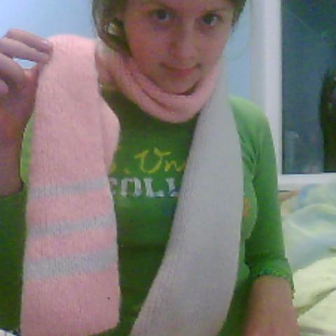 Maždaug 2 m. ilgio,virš 20 cm pločio .Labai šiltas,viena šaliko dalis balta,kita ružava ir galai baltai juostuoti.