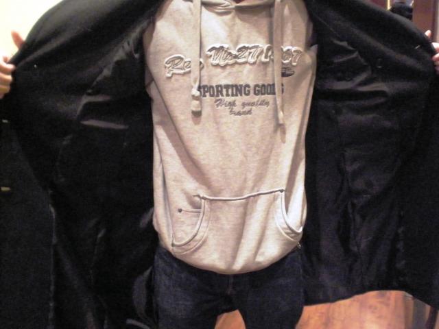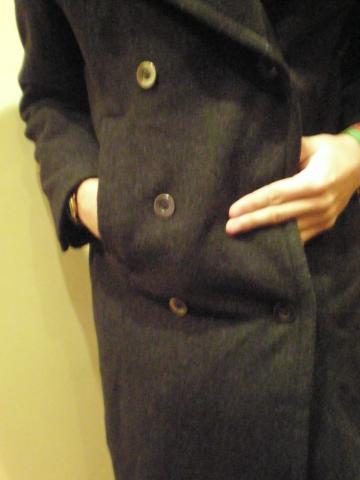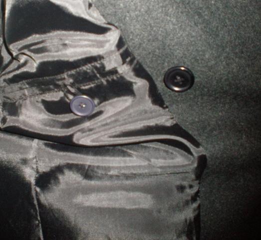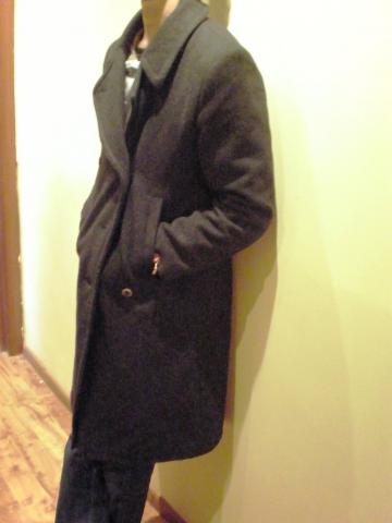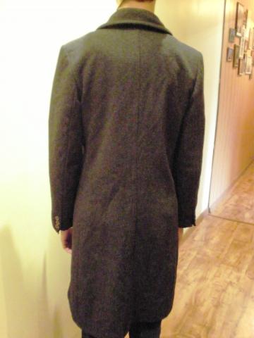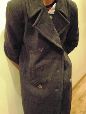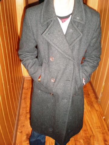 38dydis. Tamsiai pilkos spalvos. Kelis kartus devetas plius katik pakeistas pamusalas pas siuveja. Sagos isdestytos dviem eilem, taciau uzsisega is viso trys sagos. Yra vidine kisenele, taip pat ir isorines kisenes. Kalnierius gali susisegti prie pat kaklo(yra saga). Bukle: ideali. Gali nesioti tiek vyrai, tiek moterys, nes kirpimas klasikinis.