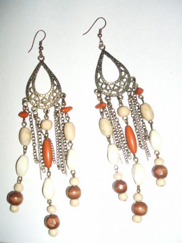 Masyvus, ilgi auskarai, mediniai karoliukai, primena indenisko stiliaus auskarus.