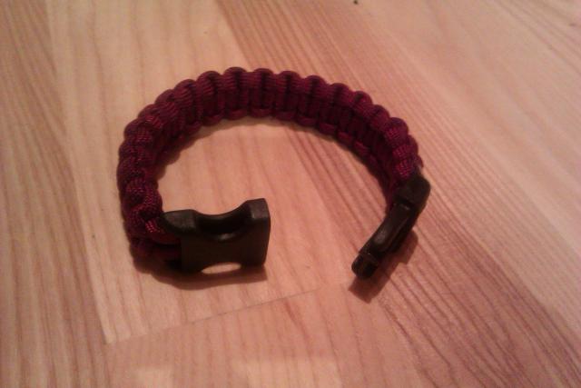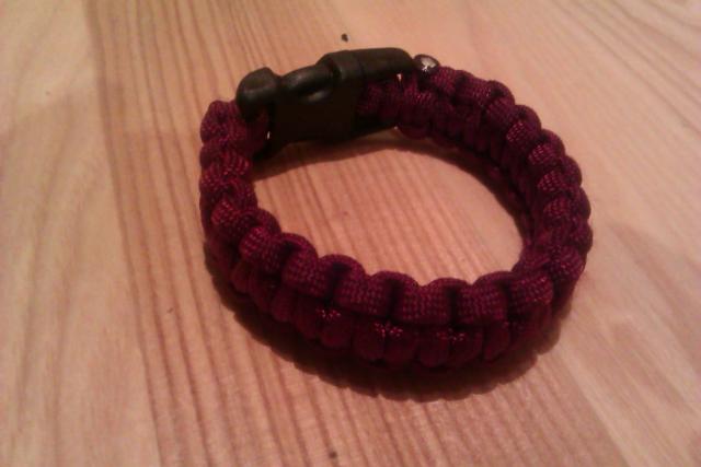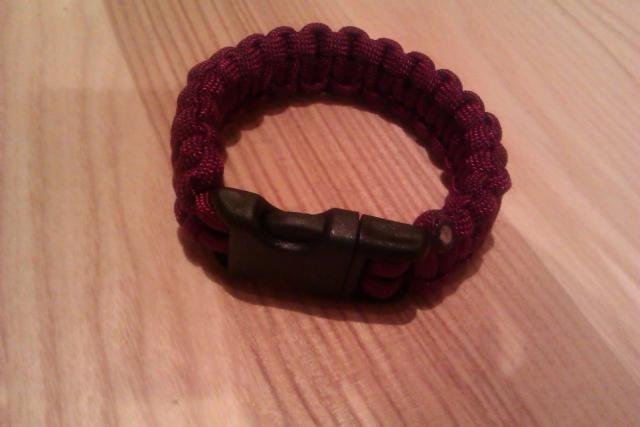 Apyrankė, supinta iš parašiutinio stropo (paracord), t.y. virvės kuri naudojamos parašiutams ir atlaiko virš 200 Kg svorio (550 Lbs). Apie tai čia - http://www.bushcraft.lt/2011/09/paracordo-testas/ . Tokią apyrankę pintą "kobros" mazgu, originaliai sugalvojo amerikiečių kariai Irake, kad pagerbtų sužeistus ir žuvusiuosius draugus. Apyrankę esant būtinybei galima išardyti ir turėsite 3 metrus virvės išlaikančios du žmones. Apyrankės spalva pagal gamintojo kodavimą "Burgundy" (bordo)