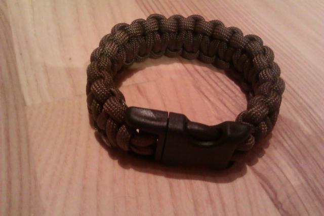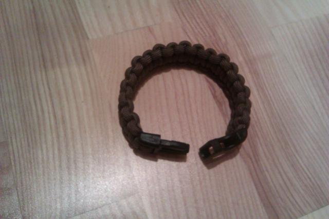 Apyrankė, supinta iš parašiutinio stropo (paracord), t.y. virvės kuri naudojamos parašiutams ir atlaiko virš 200 Kg svorio (550 Lbs). Apie tai čia - http://www.bushcraft.lt/2011/09/paracordo-testas/ . Tokią apyrankę pintą "kobros" mazgu, originaliai sugalvojo amerikiečių kariai Irake, kad pagerbtų sužeistus ir žuvusiuosius draugus. Apyrankę esant būtinybei galima išardyti ir turėsite 3 metrus virvės išlaikančios du žmones. Apyrankės spalva pagal gamintojo kodavimą "Dark Brown" (ruda)