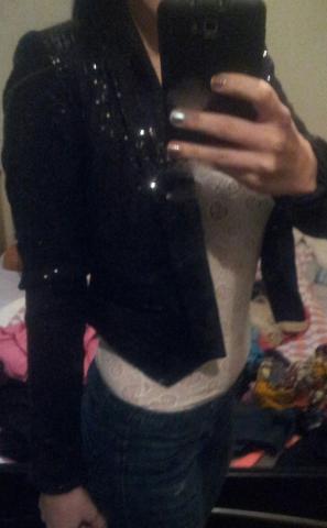 Švarkelis neilgas nugara odinė rankovės bei priekis blizgučiais už švarkelį ir sijoną mokėjau atskirai. Švarkelio kaina 29.99 eur. Sijono 12.99 eur. Pirkti Vokietijoje. Drabužiai dar su etiketėmis jei kas prašykit įkelsiu foto.Sijonas trumpas visas nusietas blizgučiais. Jei kas domina rašykite.;)
