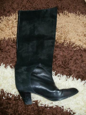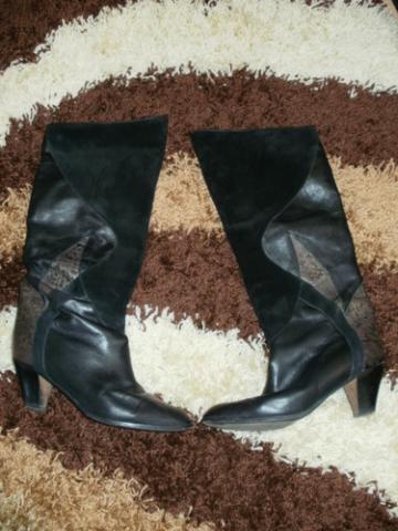 Odiniai rudeniniai batai papuošti gyvatės odos, zomšo aplikacijomis. Ant blauzdos neapsitempia (bent jau man), bet ir nekrenta žemyn :).Kulniuko aukštis apie 6 cm. Matosi, kad batukai nešioti. Nesuplyšę. Batukų dydis labiau 38,5 ... Kaina - 40 Lt, + p.i.
