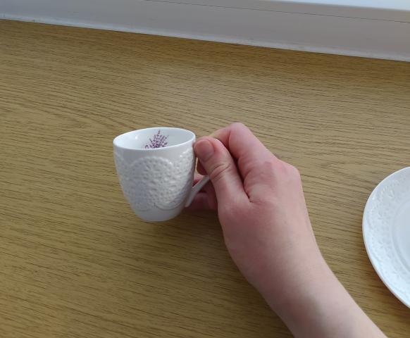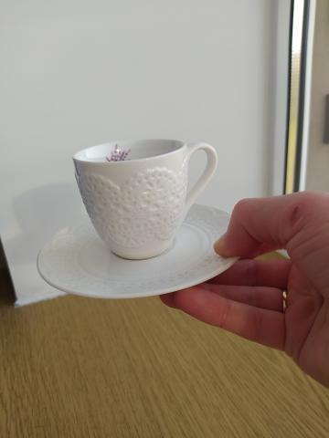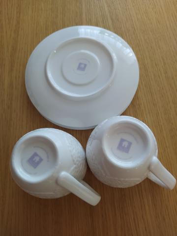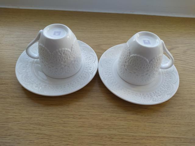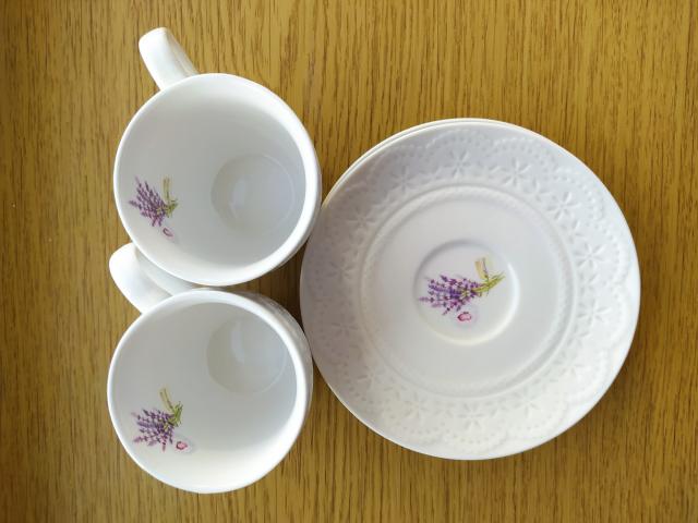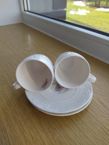 Visiškai nauji ir nenaudoti itališko porceliano indai, dvi desertinės lėkštutės ir du espresso kavos puodeliai su levandų piešiniu. Lėkštutės skersmuo 12,5 cm, puodelio skersmuo 6 cm, puodelio aukštis 6 cm. Easy life design.