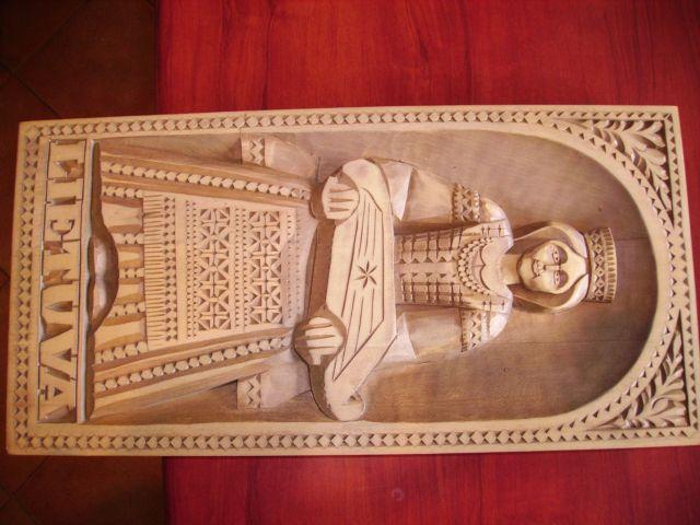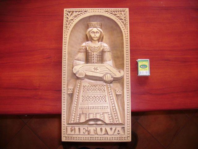 Didelis meno kurinys, ant kurio isskaptuota bobute su kanklem ir uzrasas LIETUVA. Ismatavimai 22x41 cm. Yra galimybe kabinti ant sienos.
