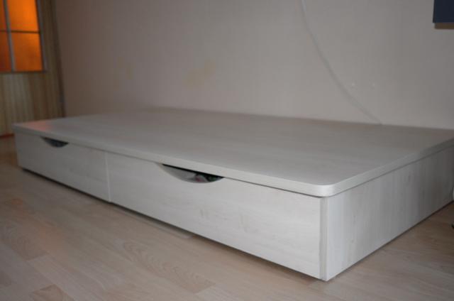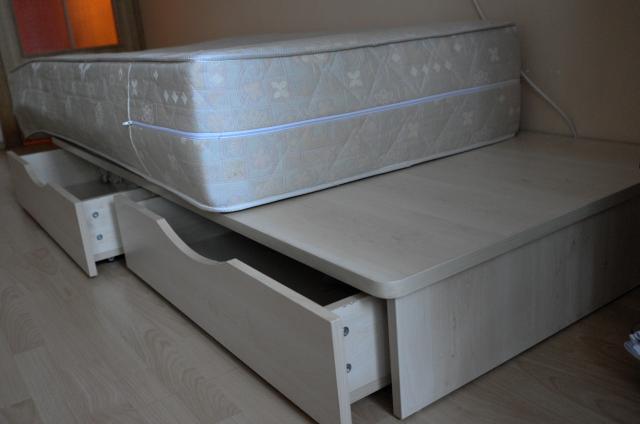 Lova-tachta-sofa (čiužinys su patalynės dėže apačioje). Dydis 90x195. Tachtą sudaro tvirtas medžio plokštės pagrindas su dviem giliais stalčiais patalynei susidėti ir ant pagrindo uždėtas spyruoklinis čiužinys. Stalčiai - su ratukais, dydis 95x80. Čiužinio užvalkalas su užtrauktuku. Tinka butui su niša. Tel.:865022550
