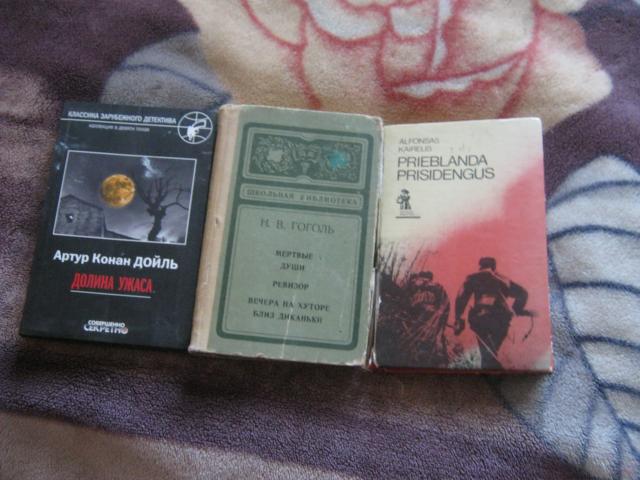 pirma knyga 2012 m dolina užasa (rusų k) 301psl.detektyvas.tvarkinga. antra knyga 1974m. Gogolio Revizorius (rusų k) 566psl. trečia knyga A.Kairelis Prieblanda prisidengus 1985m. 342psl.aptriušęs viršelis.