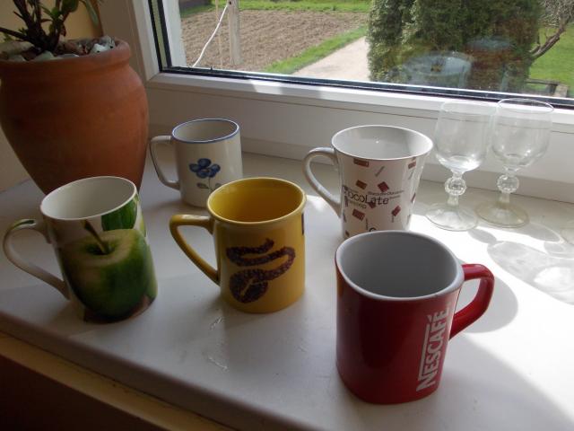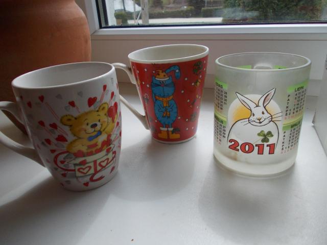 įvairūs puodeliai naudoti po viena yra s eptyni, su kiskiuku nebera, su obuoliais ir kaciuku kaip ir porcelianiniai lengvuciai