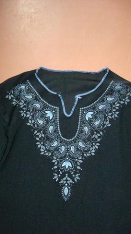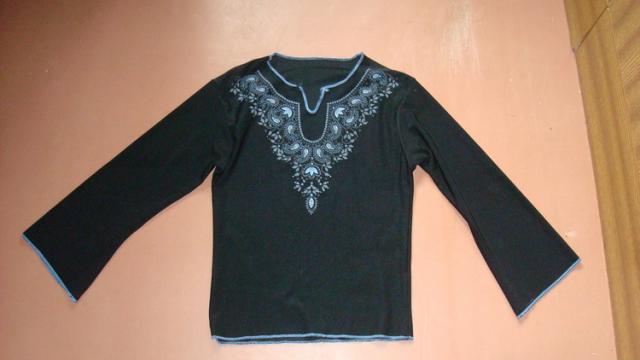 dailiai raštuota, iš lengvo, gražiai krintančio audinio, šiek tiek tempiasi, trijų ketvirčių rankovės