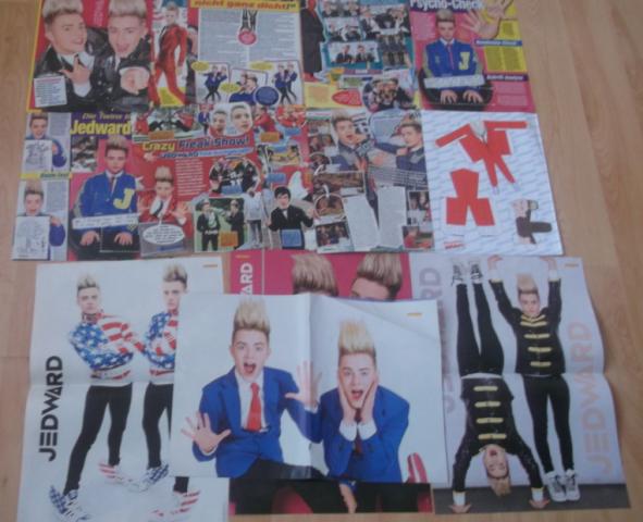 Įvairūs Jedward plakatai, yra vienas didelis MEGA. Taip pat daug įvairių iškarpų (visų nuotraukoj nesimato, bet turiu dar daugiau) Miestas Šiauliai, bet siunčiu ir į kitus.