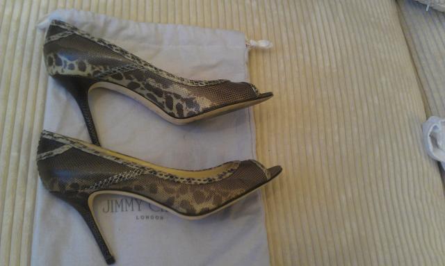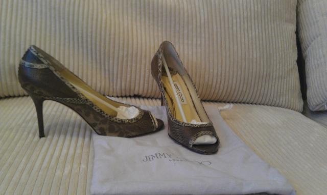 Dizainerio Jimmy Choo aukštakulniai, gyvatės odos, smėlinė oda viduje. Dydis 40, bet tinka 39. Išorė kaip nauja, jokių dėvėjimo ženklų, tik padukas pasitrynęs