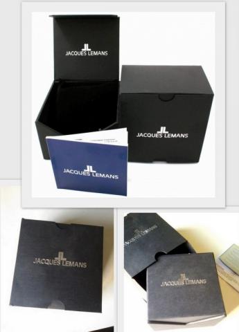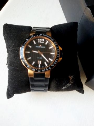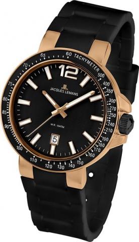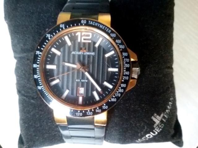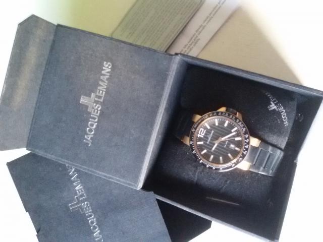JACQUES LEMANS 1-1695H. Juoda ir raudono aukso spalvos. Kvarcinis (su baterija), silikonine apyranke, rodyklinis (rodyklės švyti tamsoje), atsparumas vandeniui WR 100 m, grūdintas mineralinis stiklas, plieninis korpusas (42 mm plotis ir 10,4 mm storis). Gera būklė, puikiai veikia. Originalus įpakavimas - 1 minkšta dėžutė, 1 kieta per viršų atidaroma dėžutė, 1 pagalvėlė. Puikiai atrodo kaip dovana. Yra neryškus paviršinis stiklo įbrėžimas.