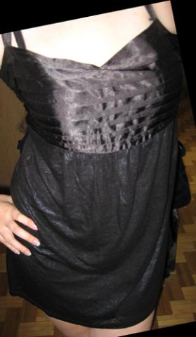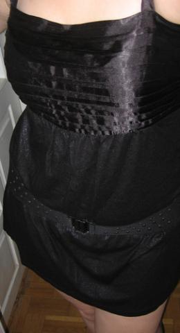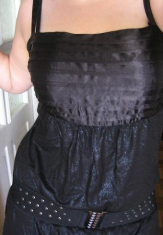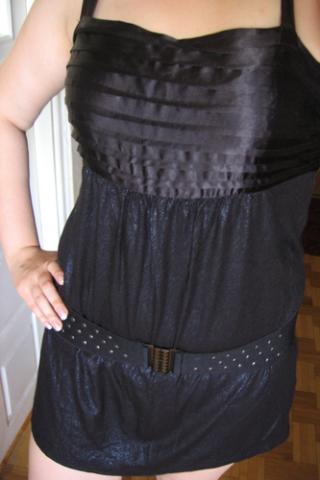 Juoda suknelė, trumpa, viršuje kluostuotas atlasas, medvilninė dalis su blizgia tekstūra, ant šleikučių, be defektų, labai smagi;] (Parduodu be diržo, jis nebuvo prie suknelės)