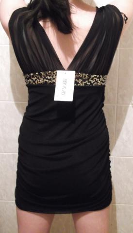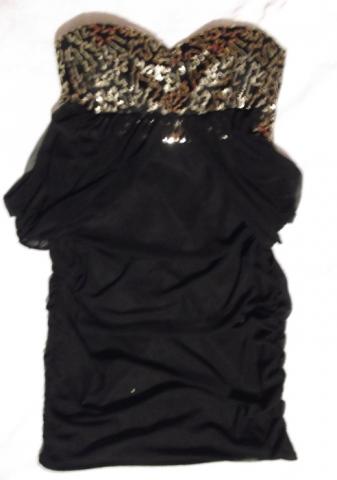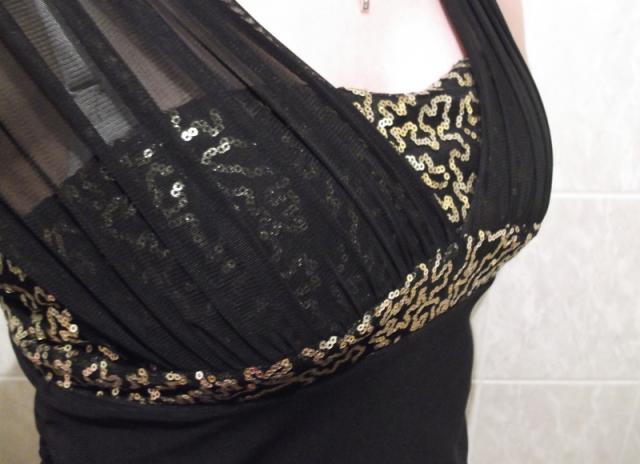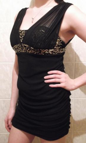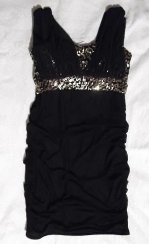 Juoda suknele, graziai atrodo, virsus puostas auksiniais zvyneliais. Tiks bet kokiai progai. Dydis XS/S/M ,tempiasi.