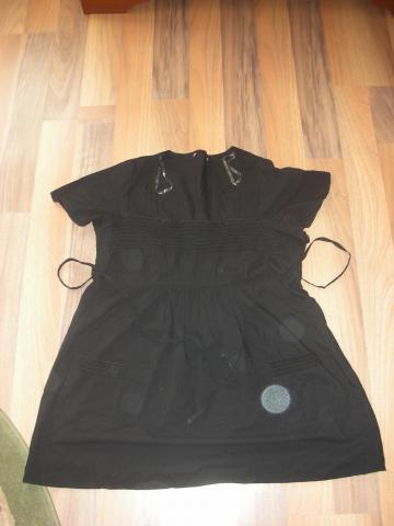Juoda,lengvo audinio,plona tunika. Susirisa virvele, po krutine medziaga sutraukta, yra kisenes :)