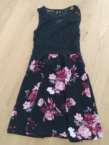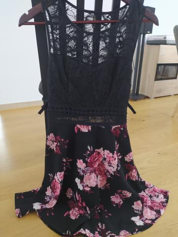 Juoda vasariška suknelė su gėlėmis. Tamprios medžiagos. Atitinka M/38 dydį. Ilgis 89 cm, krūtinė apie 80 cm (tamposi), liemuo 64 cm (tamposi, su guma). Labai mažai dėvėta. Su užtrauktuku šone.