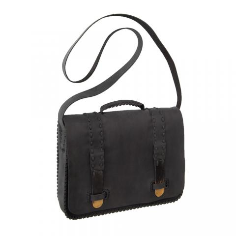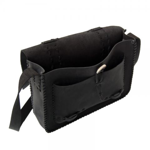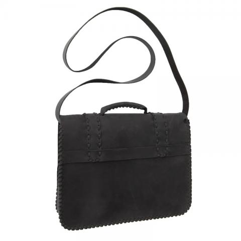 Natūrali 2 mm storio oda. Matmenys 34 x 26 x 10 cm (telpa A4 formato segtuvas). Trijų skyrių, prisiūtas karabinas raktams prisegti (gali būti skyrelis telefonui). Užsegama raginėmis plokštelėmis. Fiksuoto ilgio rankena. Oda impregnuota aliejumi.