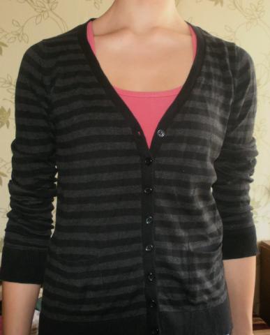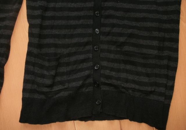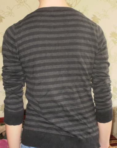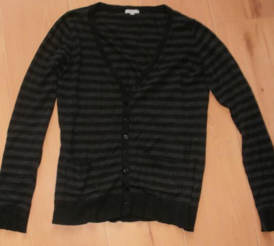 Juodos spalvos, dryžuotas megztukas be defektų, tik yra truputį prasitampęs