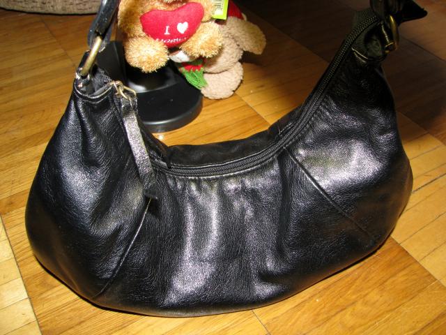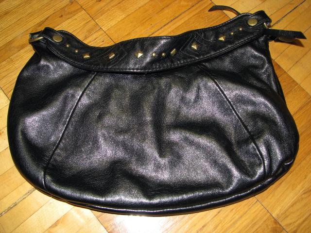 Juoda vidutinio dydžio tašytė su kniedėmis ant rankenos.