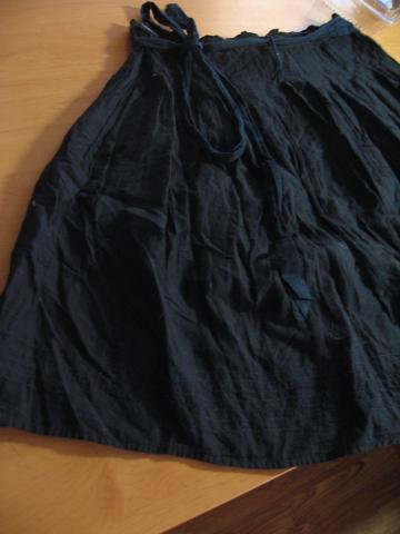 Juodas sijonas iki kelių, DEPT firmos. Gražiai platėjantis, su raišteliais, kurių ilgis reguliuojasi, gražiai apsiuvinėta sijono apačia. Labai geros būklės.