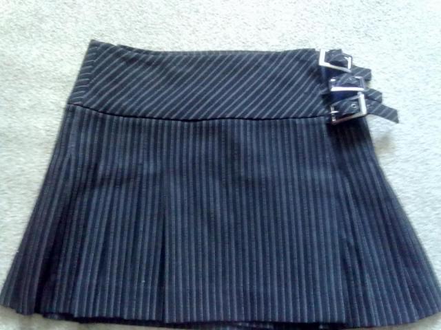Klostuotas juodas sijonas. Vientisas, apjuosamas ir susisagsto sagytėm bei diržiukais, lengvai krenta, trikotažinis. 38dydis.ilgis: 36-37cm (kad orientuotis kokio ilgio bus jums)
