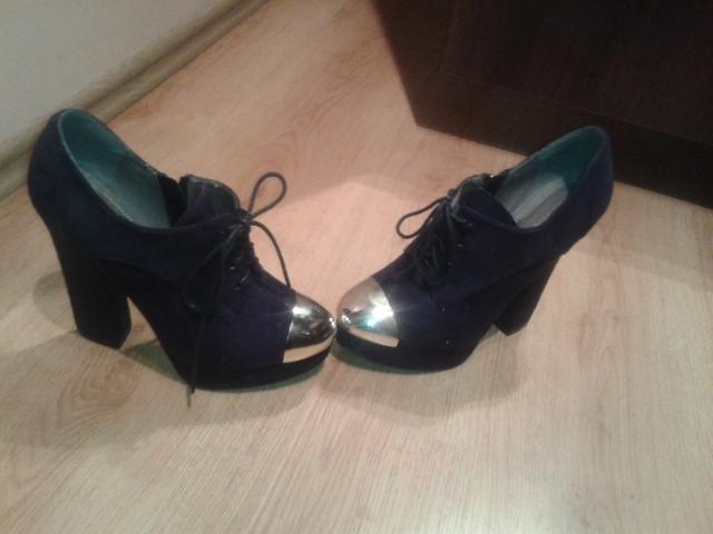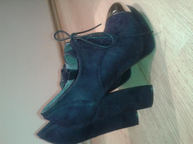 Juodi aukstakulniai, patogia keltimi, deveti kelis kartus bukle labai gera, zymiu defektu nera. kulno aukstis apie 12 cm 40 dydis vidpadis 25 cm. segasi su segtuku sone, raisteliai del grozio, bet su jais taip pat galima papildomai suverzti.
