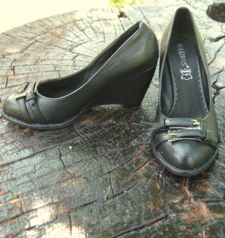 Nauji,juodi bateliai ant platformos.
