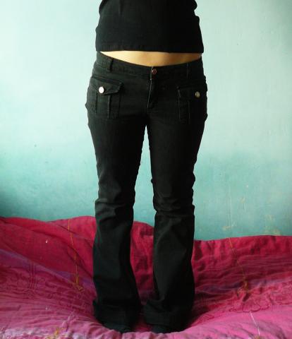 Juodi, švelniai platėjantys džinsai, M dydis, o ilgis sutrumpintas iki mano (155cm) ūgio. Tai būtų vidinės klešnės ilgis 75,5cm, išorinės/šoninės 93cm, džinsų juosmuo 88cm. Nešioti, bet kokybė dar gera. Priekyje ir užpakalyje kišenėlės tokios pačios. Jau paruošti išmetimui :D