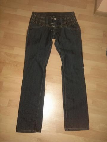 Juodos dzinsines kelnes, labai stilingos, su uztraktuku aplink klubus, medziaga siek tiek blizgi, 40 arba M/L dydis