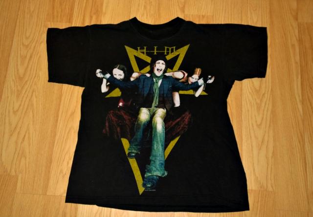Juodi marškinėliai su grupės HIM paveikslėliu. Paveiksliukai yra ant priekio ir nugaros. Marškinėlių juoda spalva pablukusi.