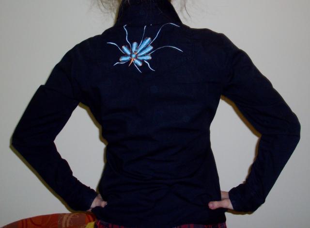 juodi marškiniai su aplikacija ant nugaros