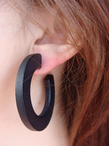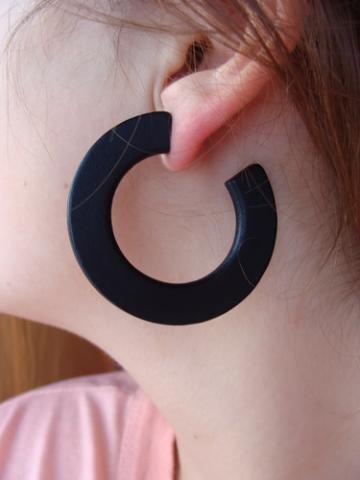 išties ganėtinai įdomūs auskarai, mediniai, juodi, gan dideli, bet lengvučiai ( skersmuo apie 5cm, jei reiks tiksliai išmatuosiu). :)