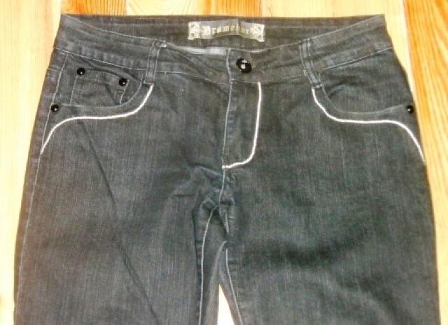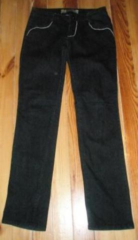 Juodi, siaurėjantys aptempti džinsai su lycra, pažemintas liemuo.