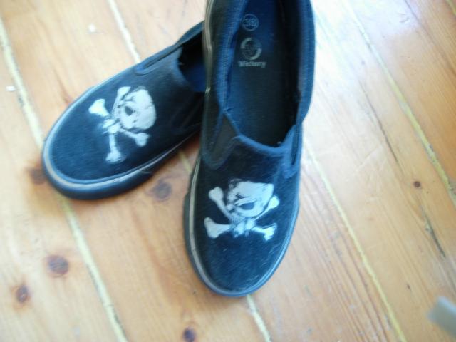 Juodi batai, su kaukolėmis (slips-on). Šiaip manau, kad tinka ne tik merginom, bet ir vaikinam ;). Nei karto nebuvau užsidėjusi, nes man jie per maži. Be defektų.