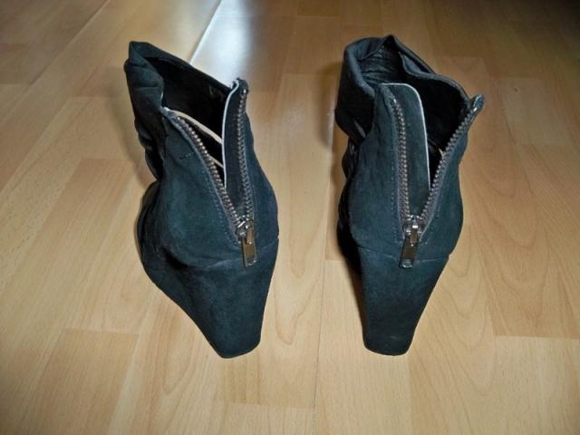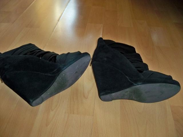 Labai geros būklės (reiktų pakalti jau) juodos natūralios zomšos ir medžiagos (priekyje) basutės. Aukštu kulnu, bet labai patogios. Kulno aukštis 12 cm, yra 1 cm platforma.Nugaros pusėje užsitraukia užtrauktuku. Dydis atitinka 39,5-40. NEMAINAU