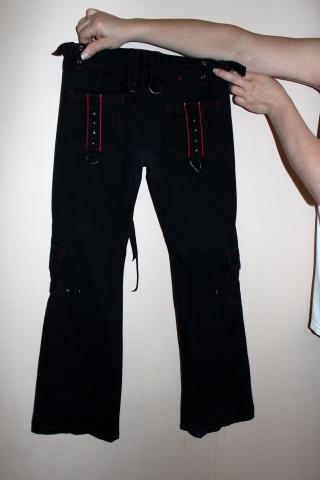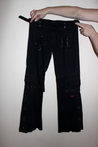 Juodos kelnės su raudonomis detalėmis. Labai gražiai atrodo, patogios, dėl to jau nemažai nešiotos ir vietomis trumputi pablukusi spalva. Pirkta #fantasmagoria