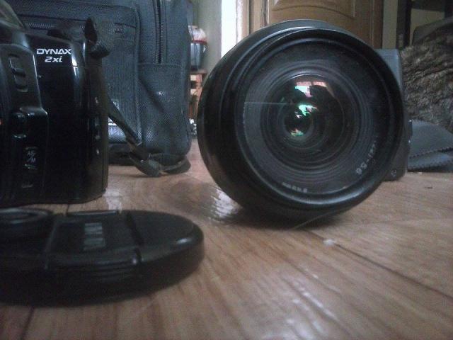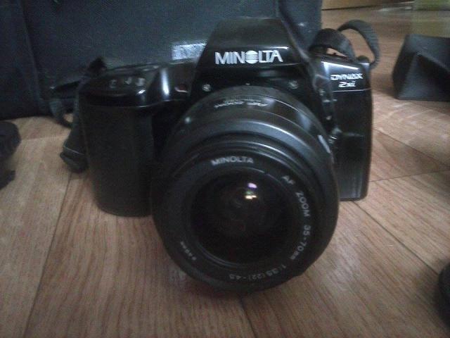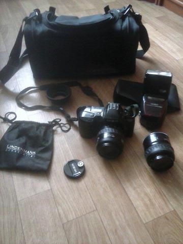 Puikiai veikiantis fotoaparatas su papildomu objektyvu, taše, uždedamu blicu ir t.t