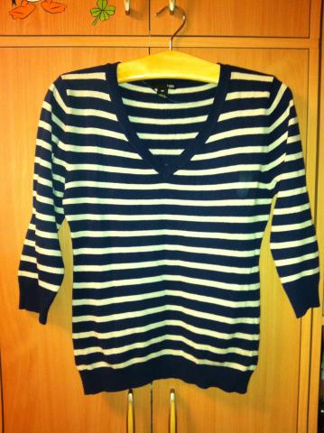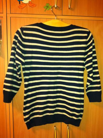 Gražus, jūreiviško tipo megztukas trijų ketvirčių ilgio rankovėmis.