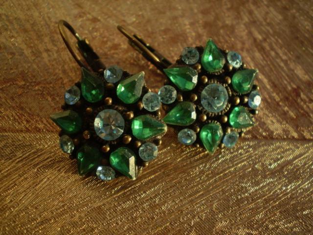 Žavūs auskarai su žaliomis ir žydromis akutėmis.